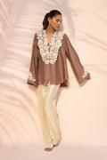 This chic mocha brown pure rawsilk ensemble features a relaxed short shirt, highlighted by a dramatic oversized ivory appliqué collar detailed with intricate floral motifs. Flared sleeves are accented with matching cut work appliqué at the cuffs. Layered over flared pure rawsilk trousers with a subtle sheen, the look is defined by clean, modern lines.