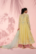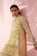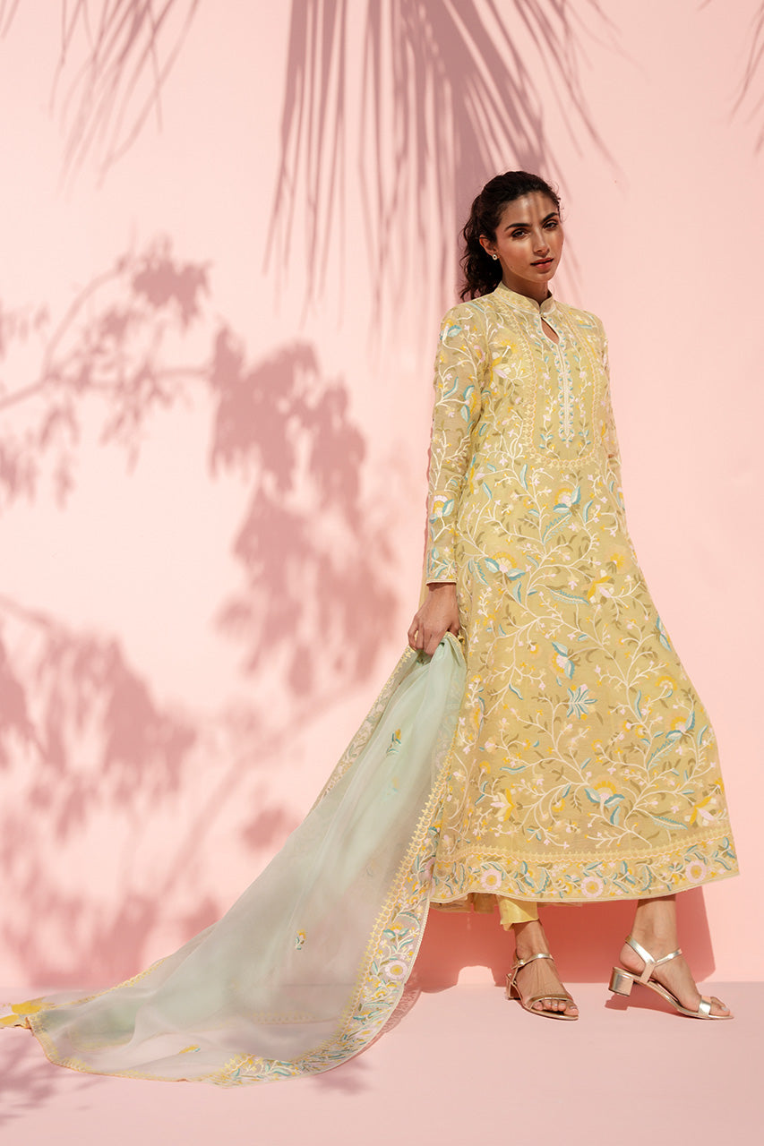 This pale yellow ensemble is defined by botanical aari embroidery, arranged in delicate vines around the keyhole neckline. The sheer khaddi corduroy shirt is adorned with floral embroidery across the surface, balanced by a refined neckline and slimfit full sleeves. It is paired with matching pure rawsilk trousers. A flowing organza dupatta, edged with fine aari detailing, completes the look with graceful movement.