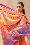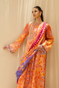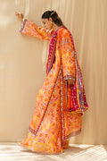 This three piece set unfolds on a tangerine canvas, alive with vivid florals reminiscent of a painted garden. An A line cotton net kurta flows with ivory scalloped accents, a dramatic side slit and an embroidered neckline, while scalloped cuffs frame the sleeves. Wide palazzos in matching cotton net echo the motif in quiet harmony. A fluid medium silk dupatta, shaded in ombre tones and scattered with jewel toned vines and blossoms, completes the look in a symphony of colour and craft.