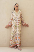 A vision of effortless elegance, this blush cotton net kaftan unfolds in a relaxed long silhouette with side slits. The neckline is traced with delicate embroidery, while vivid crimson and ochre borders frame the sleeves and hem in geometric detail. Across the canvas, painterly motifs of pomegranates, vines and blossoms bloom with a subtle shimmer of sequins, evoking the romance of hand painted tapestries.