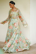 A misty tea green organza kaftan unfolds with painterly florals in soft blush and coral tones. The deep split neckline is framed with intricate hand embellishment in sequins, gota and thread accents that echo onto the khaddi silk tube top, catching the light with subtle brilliance. Full sleeves end in ornate gota borders, while tassel ties at the side slits add playful movement. The hemline, edged with shimmering gota, gives way to a matching printed khaddi silk lehenga that cascades into a pool of ruffles.