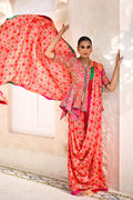 A striking ensemble presents a coral pink peplum in cotton net, richly adorned with intricate gold and silver gota embroidery. Elbow length sleeves are accentuated with voluminous shoulder puffs and finished with delicate floral motifs and shimmering beadwork. The structured peplum silhouette flatters the form, while a vibrant khaddi silk pre draped dupatta, patterned with bold geometrics in crimson, hot pink, green and coral, is framed with golden detailing over chatapatti printed borders.