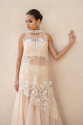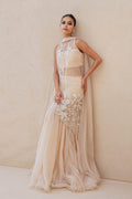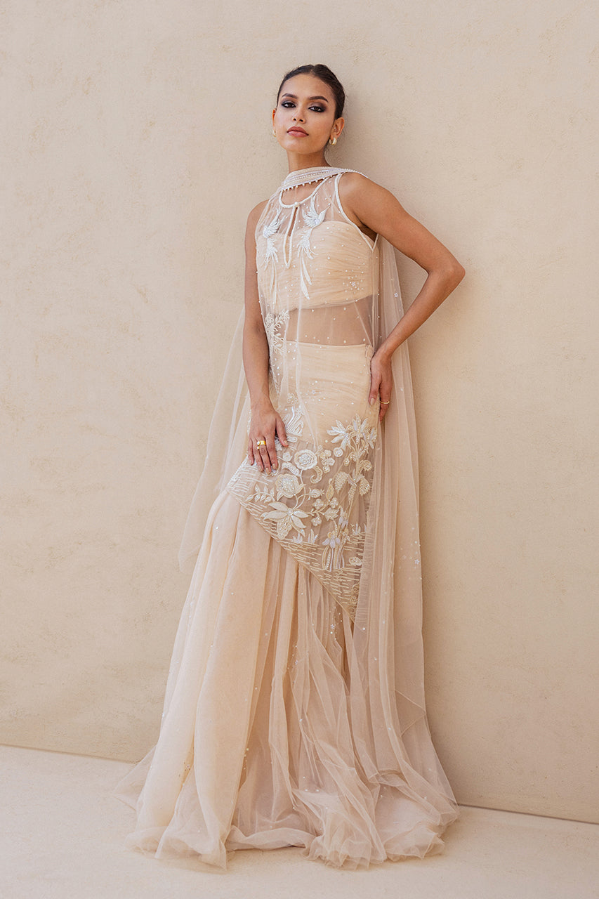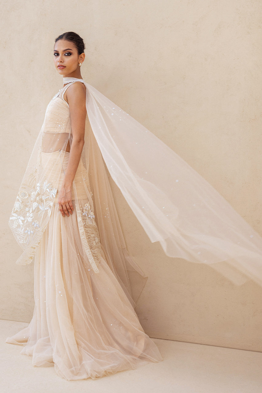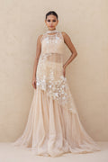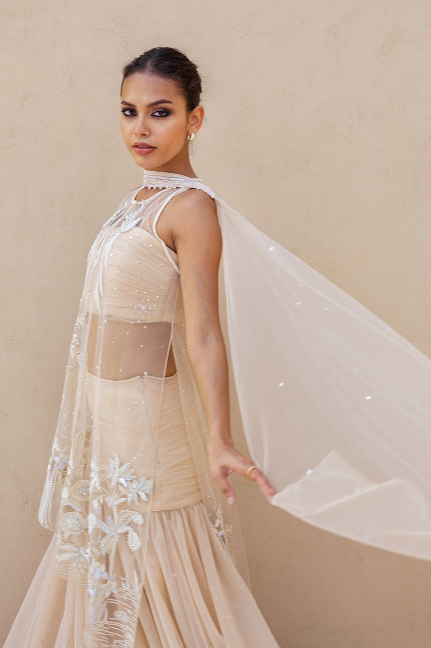 A vision in soft peach tulle, this ensemble unfolds in fluid layers of drapery. The asymmetrical shirt, sheer and delicately structured, is embroidered with ivory threads, beads, and sequins that trace blooming florals across its surface, finished with eyelet accents. A refined neckline with subtle linear embellishments adds depth and dimension. Flowing into a voluminous tulle skirt, dusted with faint shimmer and resham florals, the silhouette carries a dreamlike lightness. A matching tulle choker dupatta with beaded borders and a ruched tulle bandeau completes the look with quiet grandeur.