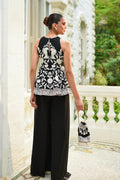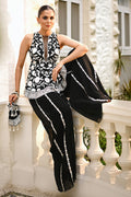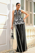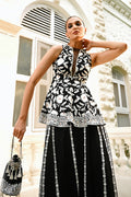 In sheer ebony khaddi corduroy layered over crepe, this sculpted peplum is embroidered with ivory florals and edged with diamanté accents. A deep slit neckline with a tulle insert lends a touch of modern sensuality. Flowing palazzo trousers in georgette, defined by vertical embroidered panels, create a statuesque grace. The ensemble allows its crisp tailoring and bold geometry to speak with quiet confidence. A coordinating embroidered pouch, finished with pearl tassel accents, completes the look with vintage charm.