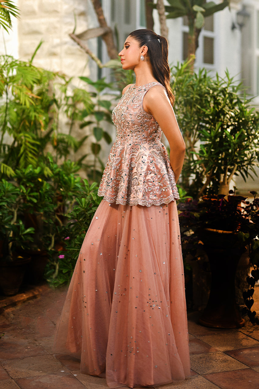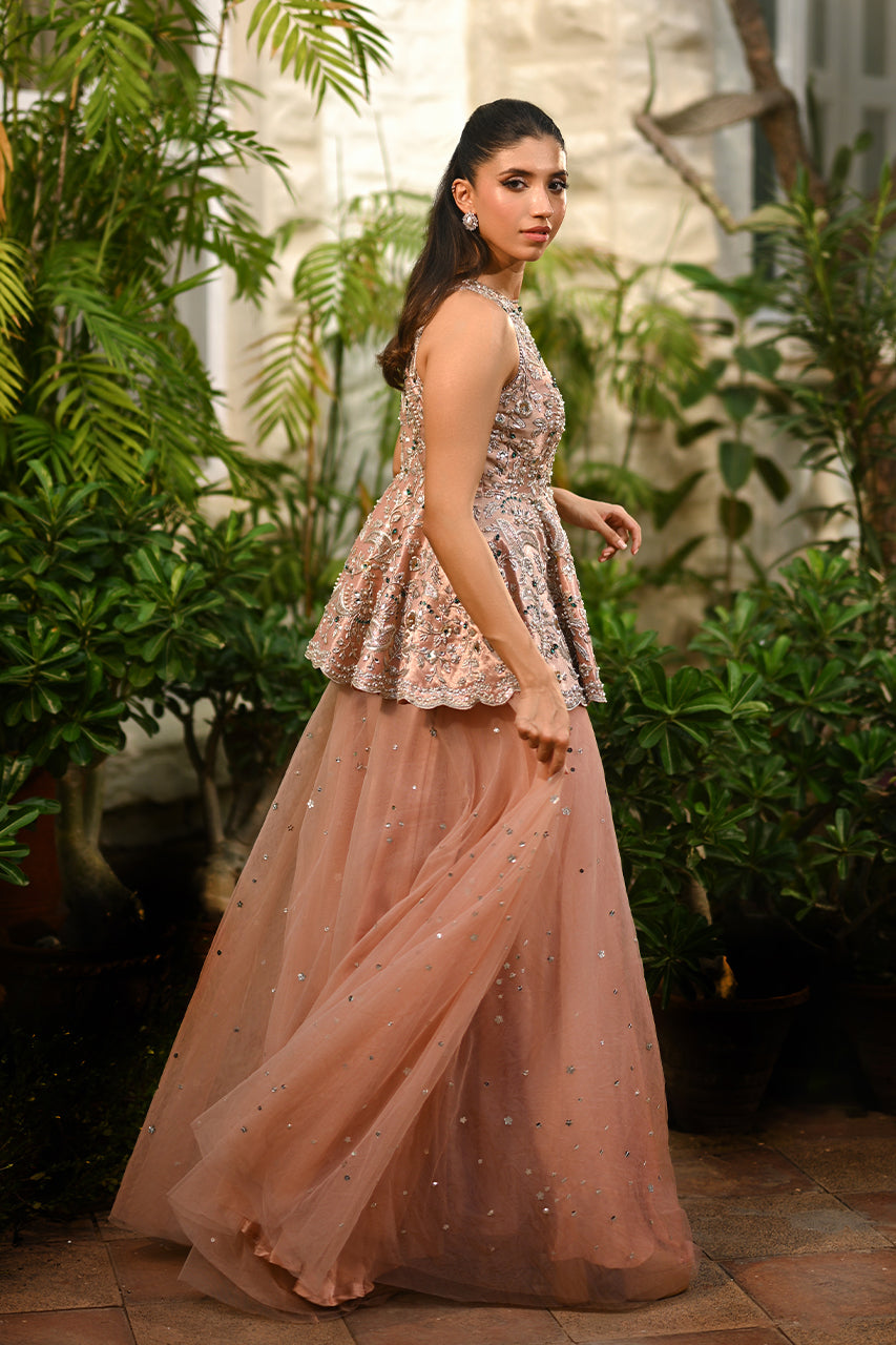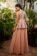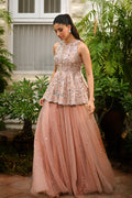 A rose gold tissue peplum shimmers with mirrored sequins, emerald diamantés, and zardoze embroidery arranged in symmetrical patterns reminiscent of Mughal jaali. The sleeveless bodice flares gently at the waist, sculpting the silhouette with refined grace. Beneath, a voluminous layered tulle skirt glistens with scattered sequins, completing a look that embraces a modern couture sensibility.