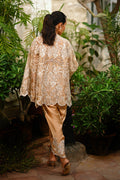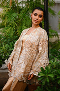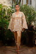A whisper of gold, this ensemble pairs an opulent tissue jacket with charmeuse silk separates. The jacket blooms with intricate ivory threadwork, appliqué details, and cutwork florals, scalloped along the hem and flared sleeves for dramatic grace. A sleek charmeuse tube top anchors the look, while a tapered tulip shalwar in charmeuse is adorned with floral embellishment, scalloped edges, and tonal appliqué embroidery trailing the seams for a soft, elegant finish.