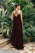 Make a chic statement on a chilly winter night in a burgundy velvet crew neck dress that drapes beautifully, creating a captivating play of shadow and light. The cut-worked details of the meticulously embroidered neckline and rich jewel tone transcends this one into a festive ensemble elevated with an asymmetrical, champagne hued waterfall skirt cut from buttery soft charmeuse.