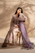 A delicate pink lavender hued kaftan in lustrous khaddi silk serves as a canvas for intricate scenic embroidery. Painterly motifs of flamingos, butterflies and blooming flora rendered in muted rose, pistachio and ivory resham bring the relaxed silhouette to life with quiet elegance. The intricately detailed neckline is finished with beaded tassels for a touch of movement. A cascading deep lilac organza dupatta is edged with eyelet floral borders and pompom details while matching pure raw silk culottes complete the look.