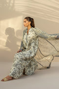 An ethereal ensemble in soft celadon and ivory tones, this look features a delicately printed column dress adorned with avian print and aari embroidered vines on the neckline. The pure rawsilk dress is layered with a sheer, printed organza jacket intricately worked with aari, lending the ensemble a regal feel.