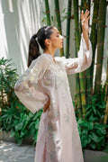 Soraya is a stunning amalgamation of meticulously composed floral applique elevated with hints of glistening resham, pearl, and sequin details. The subdued charm of this pale pink organza a-line kameez and dupatta with scalloped edges speaks volumes. Paired with a pure rawsilk slip and culottes with fully embroidered and scalloped hem.