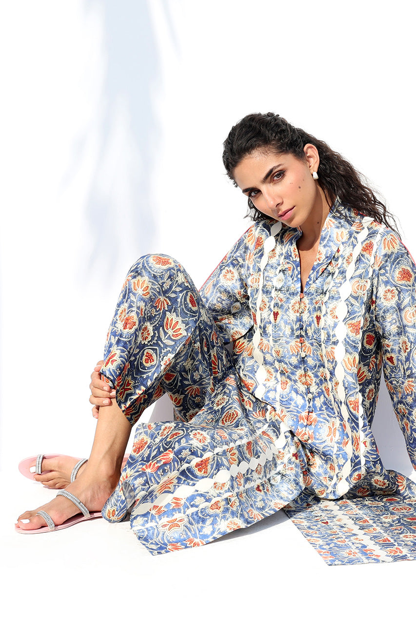 A striking ensemble in pure Raw Silk, this look celebrates artisanal print and effortless ease. The long, relaxed kurta showcases an intricate pattern inspired by traditional tilework, rendered in tones of cobalt, amber, and ivory. Intricately textured vines created through fabric manipulation trace the front, while a collared neckline and scalloped sleeves lend refined detail. Paired with matching printed culottes, the ensemble captures contemporary sophistication with handcrafted charm.