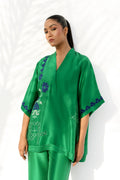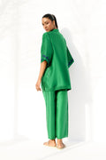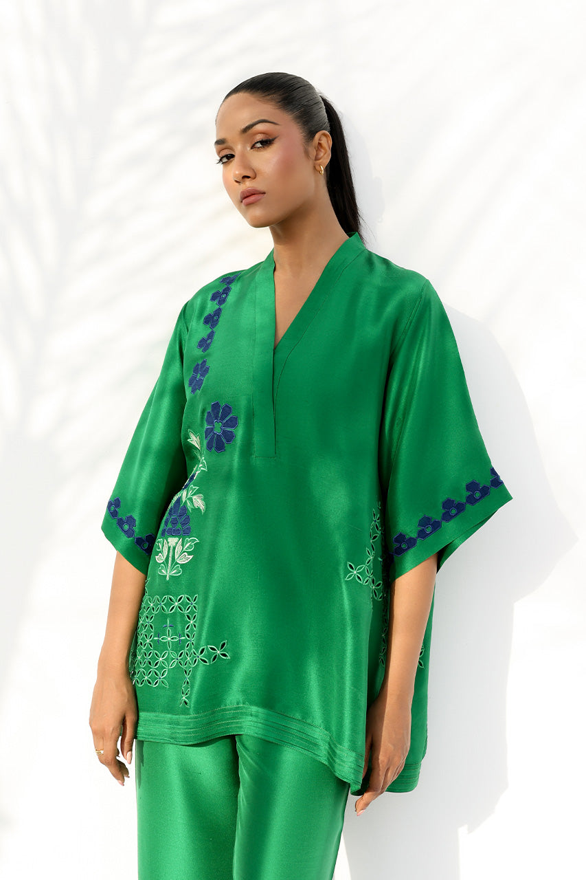 Cast in a vivid jade pure Raw Silk, this contemporary co-ord set features a relaxed boxy top with a refined V-neckline. Intricate tonal and indigo floral applique and eyelet embroidery are artfully placed along the front asymmetrically and sleeves, adding depth and texture. Paired with sleek culottes, the look embodies modern ease with a touch of elevated artistry.
