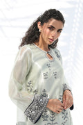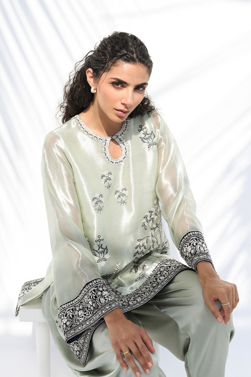 A soft celadon ensemble that captures effortless elegance with a relaxed kurta, intricately embroidered with floral motifs in indigo and silver tones. Velvet borders with ornate hand embroidery accent the cuffs and hem, adding depth and texture. Paired with a draped charmeuse shalwar that falls in gentle folds, the look strikes a graceful balance between structure and fluidity.