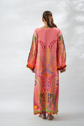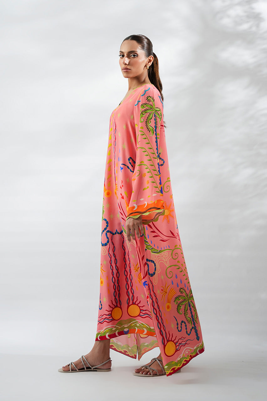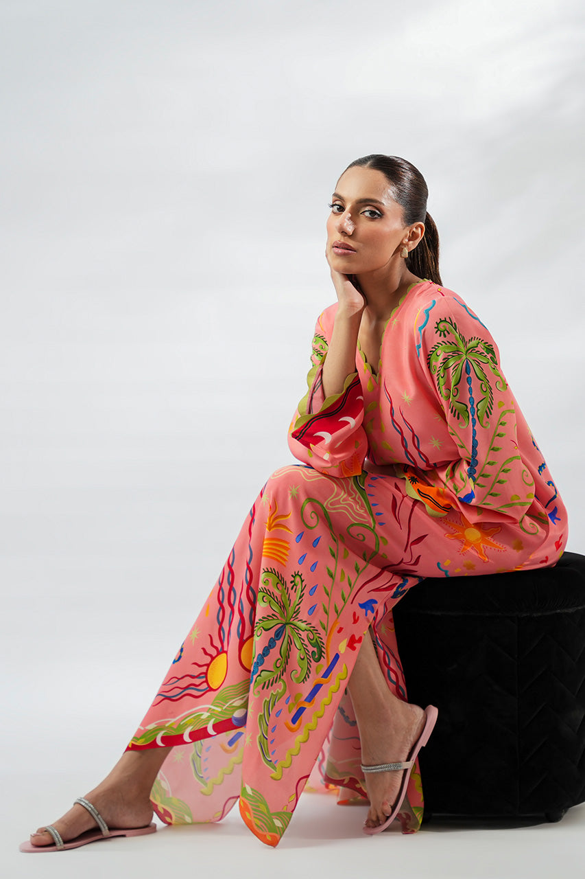 A flowing crepe kaftan in lively coral, adorned with a statement print that fuses tropical motifs and abstract geometry. Palm trees, suns, and organic forms unfold in vivid tones of cobalt, chartreuse, and tangerine. The look is finished with a delicately scalloped neckline and billowing sleeves for an effortless, artful finish.
