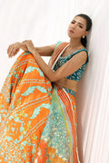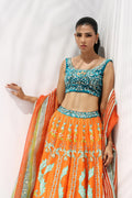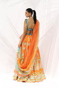 In jewel tones of teal and tangerine, this ensemble strikes a balance of artistry and finesse. The teal velvet cropped blouse is richly embroidered with gilded vines and florals, its dark surface shimmering against the light. It is paired with a flowing pure raw silk lehenga in layered tones of blue, adorned with fine gota embroidery, delicate sequins, and painterly florals that scatter across its expanse. A diaphanous organza dupatta, edged with gota and finished with tasselled accents, completes the look with refined elegance.