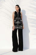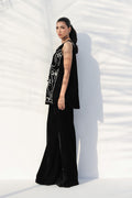 This ebony velvet creation radiates quiet luxury, featuring intricate nature-inspired zardoze embroidery that exudes an ethereal charm. The softly tied neckline lends a touch of refinement, gracefully framing the face as the fabric drapes with liquid fluidity. Paired with tailored trousers, this ensemble is a seamless fusion of timeless artistry and modern elegance.
