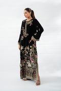 Majestic and artful, this black velvet kaftan channels regal splendor through exquisite craftsmanship. Intricate resham and zardoze embroidery in shades of fuchsia, gold, and ivory create a tapestry of floral and Mughal-inspired motifs. The neckline and sleeves are finished with delicate zardoze embroidered trims. Mythical horse figures gallop across the hemline, framed by ornate architectural patterns that lend a storybook grandeur.