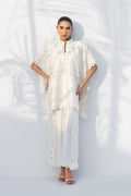 This ivory-hued pure Raw Silk outfit makes a statement with a textural, cutwork design. A box cut shirt with a mandarin collar, adorned with intricate, oversized floral cutwork embroidery and a scalloped hem. The top is paired with flared overlap pants that continue the same detailed floral cutwork, featuring a scalloped border. The look is entirely defined by the striking three-dimensional texture created through resham and appliqué craftsmanship.