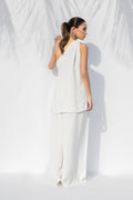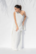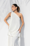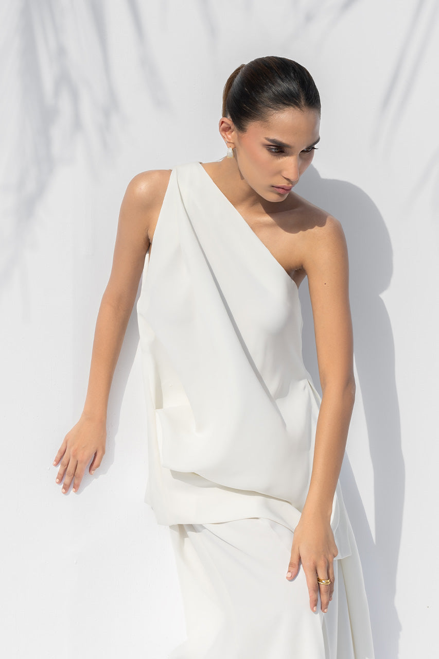 In luxurious pearl-hued Italian crepe, this outfit makes a statement with its silhouette. It pairs an asymmetric one-shoulder top, subtly sculpted with soft tucks, with dramatic, wide leg palazzo trousers. The look is entirely minimalist, defined by the precise tailoring and the fabric's effortless drape.