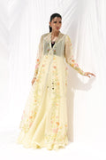 Soft as morning light, this ethereal ensemble evokes a garden in bloom. The long organza angarkha in pale buttercream is printed with painterly florals in blush, peach, and sage. Each gota detailed motif trails gracefully along the silhouette, while a gota edged placket lends a touch of subtle luminosity. Layered over a peshwas with a velvet bodice featuring zardoze and resham embroidery and a khaddi silk flare, the look is finished with a cascading ruffled hem that adds gentle movement to its timeless charm.