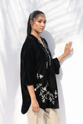 Rendered in ebony velvet, this statement shirt features delicate zardoze embroidery with floral and botanical motifs along the front. The relaxed silhouette, highlighted by a softly embellished neckline and cropped balloon sleeves, exudes effortless elegance. Paired with an ivory-toned charmeuse shalwar, the look strikes a perfect balance between modern minimalism and timeless allure.