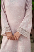 Elmiya is a two-piece unstitched winter outfit in slub viscose, featuring a dusty rose base with tonal floral prints. Accented with delicate lace trims on the sleeves and trousers, it blends warmth with quiet elegance — perfect for effortless winter wear.