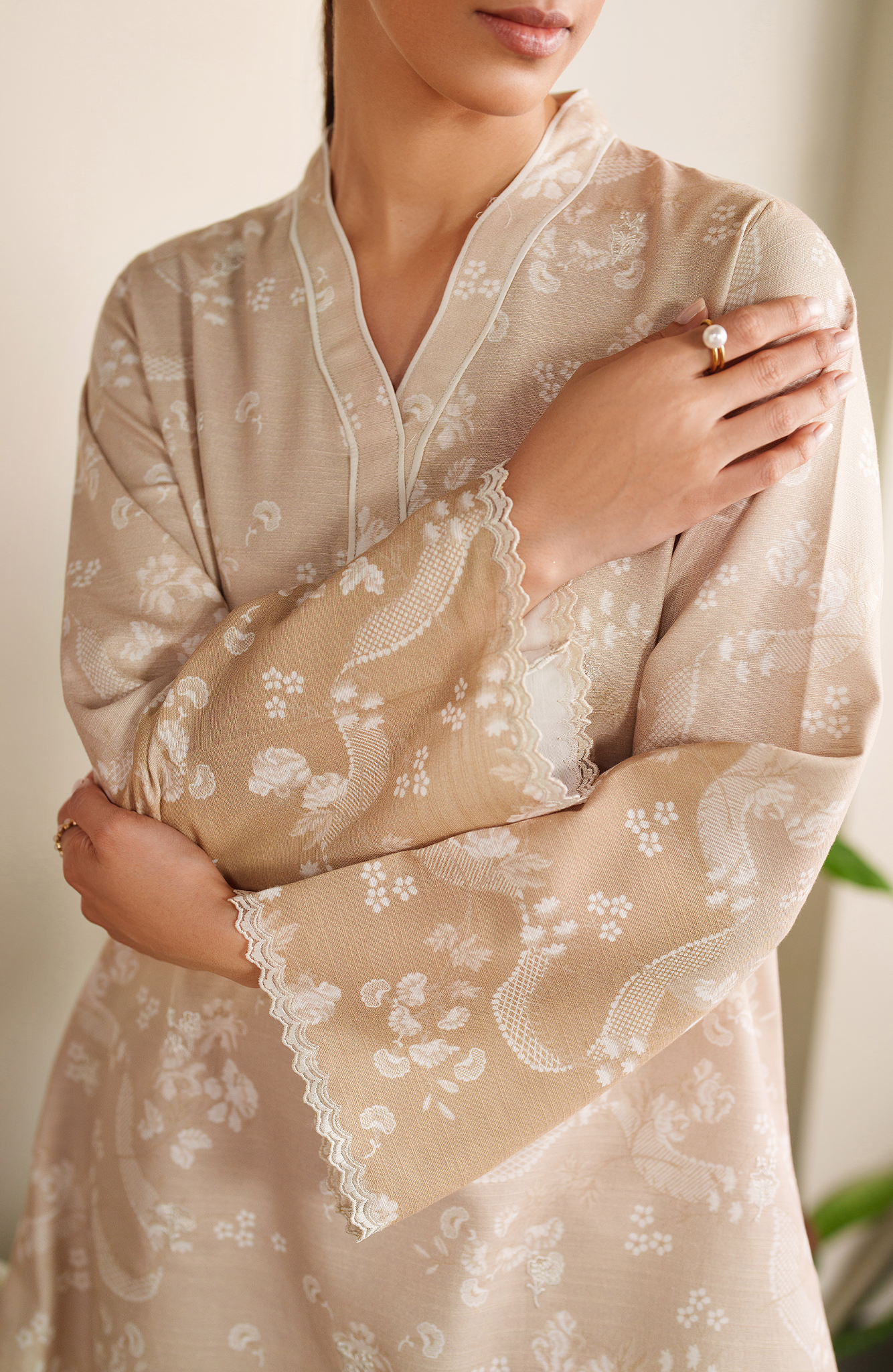 Lumen is a cozy winter slub khaddar two-piece in soft beige with delicate white floral and paisley prints. Subtle embroidered borders add a refined touch, making it warm and effortlessly stylish.