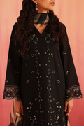 An elegant black ensemble adorned with intricate thread embroidery. The fully