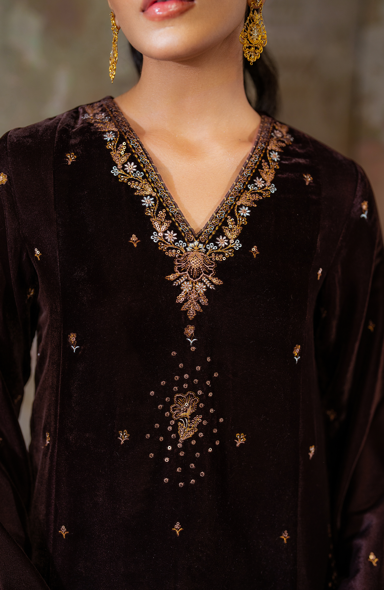 Elevate your festive wardrobe with this luxurious chocolate- brown velvet ensemble, featuring intricate zari embroidery, gota work, and sparkling sequins. The tailored shirt and embroidered dupatta with a scalloped border exude timeless elegance. Paired with matching trousers, this piece blends tradition with modern sophistication. Perfect for weddings or formal events.