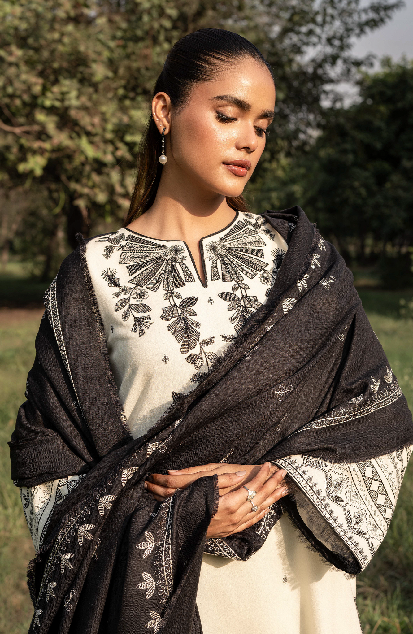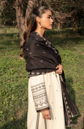 A vision of refined elegance, this off-white Karandi ensemble enchants with delicate black floral and geometric embroidery. The intricate detailing at the neck, sleeves, and trouser hem exudes timeless sophistication, while the embroidered blended shawl adds an opulent finishing touch. Subtle, luxurious, and undeniably chic.