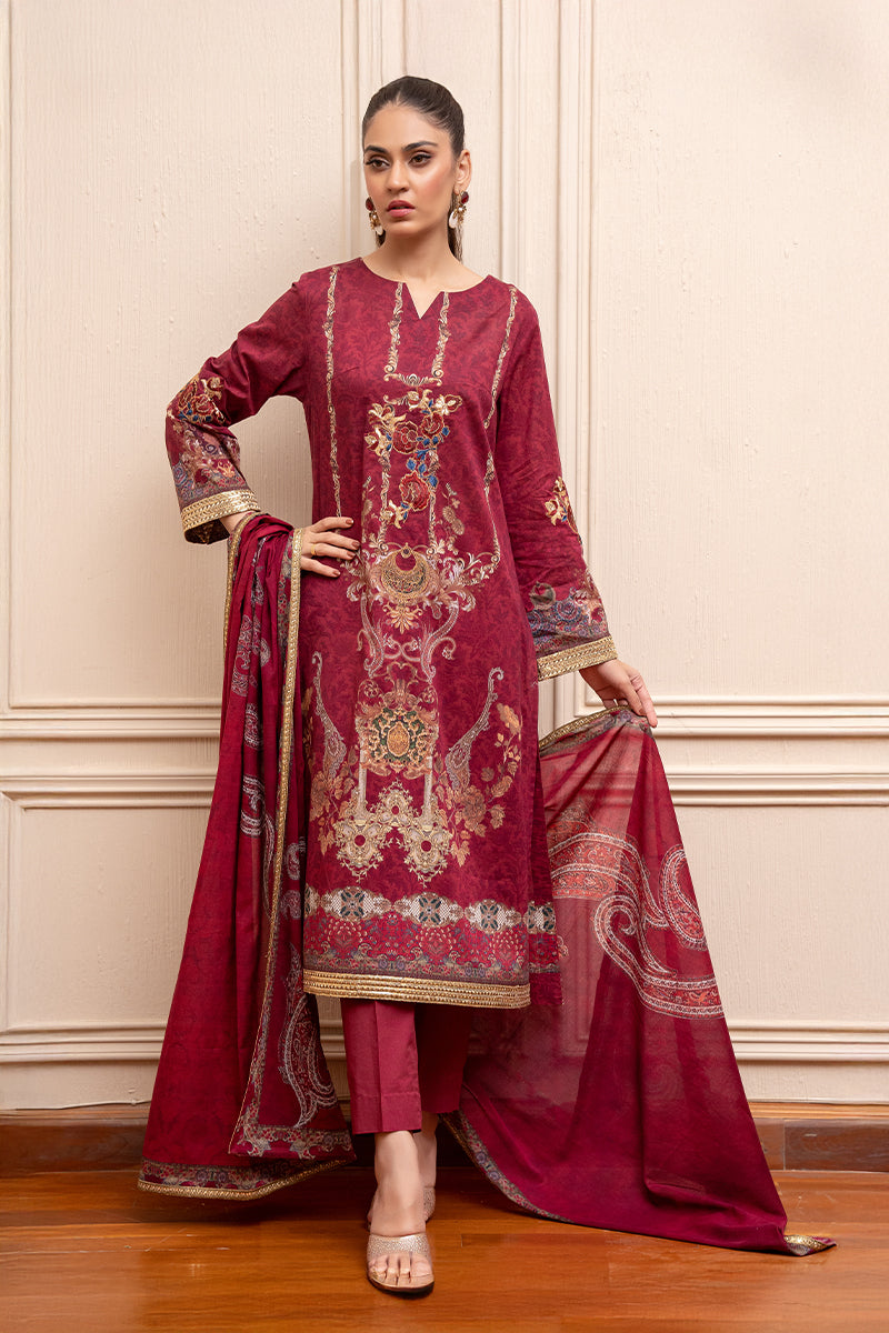 Completing the set is a coordinated dupatta in the same rich maroon tone, adorned with traditional patterns and border detailing along the edges. The dupatta adds softness, flow, and a graceful finishing touch to the ensemble. Overall, this outfit delivers a classic, elegant, and festive look, making it ideal for celebrations, Ramadan gatherings, and cultural occasions.