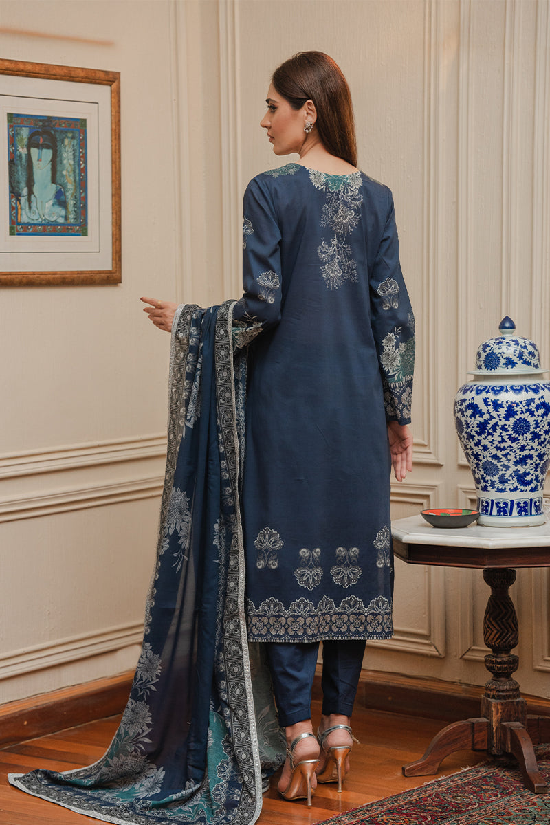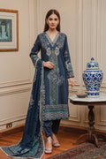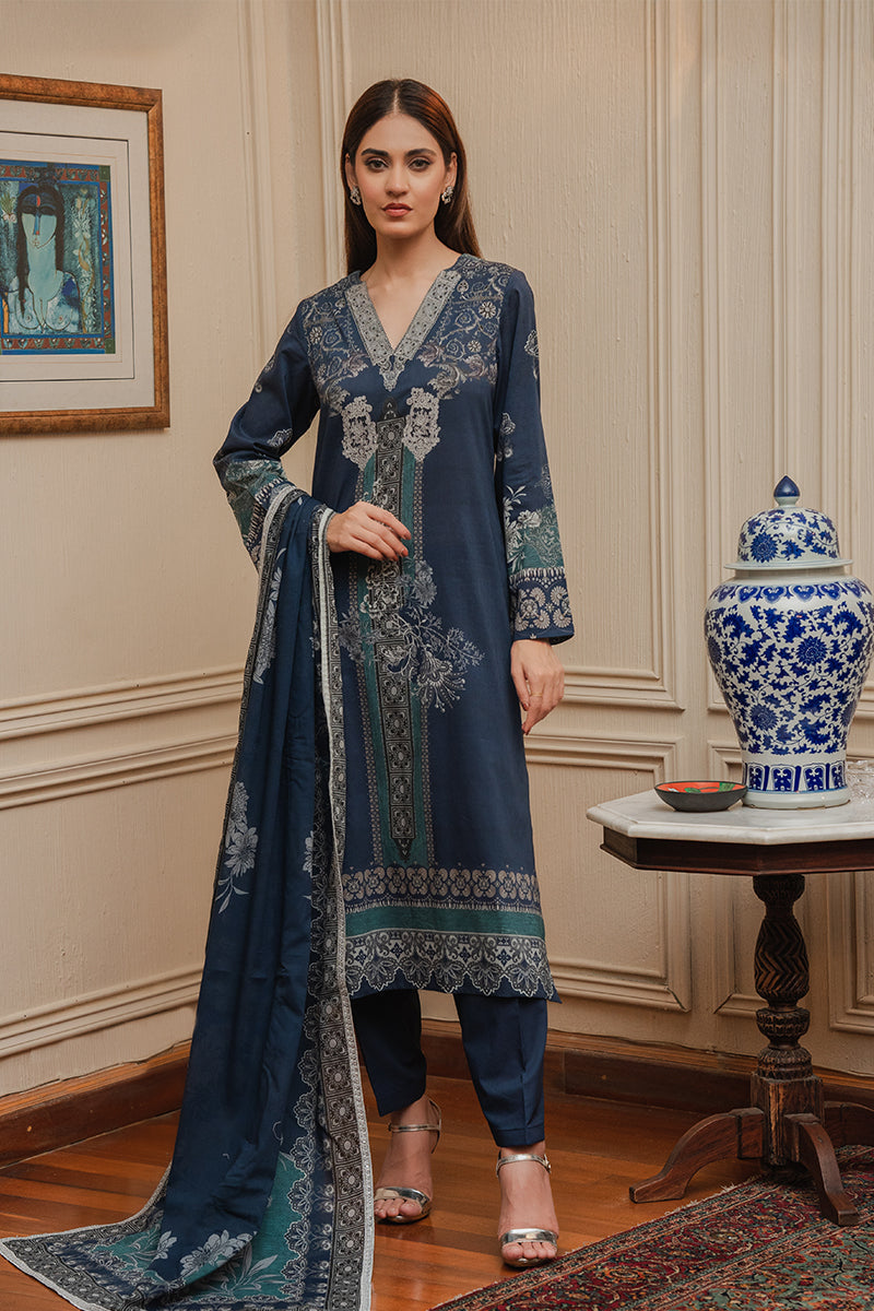 It is paired with matching straight-cut blue trousers that keep the silhouette sleek and balanced, allowing the detailed shirt design to stand out. Completing the set is a coordinated dupatta in complementary shades of blue and teal. It features fine border detailing and scattered floral motifs, adding softness and flow to the structured kurta.