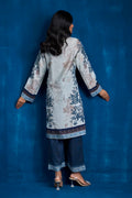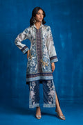 This khaddi silk co-ord set is a versatile choice, ideal for both casual outings and evening soirees. The printed ensemble features elegant collar details and floral embroidered motifs accentuated with sequins and pearls. Paired with classy pants that feature long slits, it offers a perfectly sophisticated summer look.