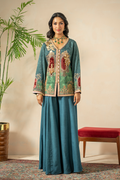 A regal emerald jacket adorned with plush velvet appliqués, intricate gold detailing, and signature Shamaeel craftsmanship — paired with wide-legged teal pants for effortless elegance. This ensemble is a true reflection of Shamaeel Ansari’s couture identity — rich, artistic, and timeless. The emerald-toned jacket features a beautifully structured silhouette with a V-neckline and front closure accentuated with ornate embellishments. Plush deep burgundy velvet appliqués, heritage-inspired motifs, and elaborate gold threadwork come together to create a composition that is both bold and sophisticated. The sleeves and hem showcase intricate embroidered borders, adding depth and luxury to the piece. Paired with matching wide-legged teal pants, the outfit exudes effortless flair and fluidity perfect for festive gatherings, evening soirées, and statement-making occasions.
