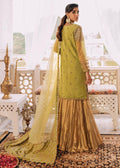 Description: Made in an ornate regal green, our elegant countess, ‘Malika Jahan’ is a beauty in the royal court. Adorned in shimmery gold tilla and resham embroideries, the bespoke pure organza ensemble is hand embellished with naqshi, dabka and crystal beading. Micro sequins in shimmery gold, vintage bronze and copper create a sense of aura and magnanimous beauty. The matching pure organza duppata with adda work and a crushed gold tissue sharara make Malika Jahan the statement piece of the season.