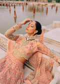 Description: The rani, ‘Nawab Bai’ is opulence and royalty at the highest level. She rests at the banks of sungaimurmur fountains at Shalimar Bagh and dwells in her own aura. The rose gold ensemble in soft bareeze net lehnga choli duppata set mimic the polki diamond jewellery Nawab Bai wears at her daily rounds of the gardens. The most exotic fauna and floral are chosen to create motifs for the beauty and brought to life in gold tilla. Vivid crimson, olive green and magnolia orange resham embroideries create the perfect scenery for crystal, sitara, pearls and Swarovskis. Her opulence is magnified through hand embellished beading and bejewelled details.
