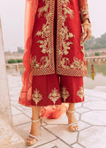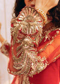 Description: Jaan-e-Jahan; our ‘Nawab Jaan’ is the showstopper for the season. Her ambitions are full of passion and she likes to be by herself, involved in poetry and calligraphy. Her ensemble is her identity. The ruby red soft bareeze net shirt duppata has floral embroideries with a jaal pattern running in between. The same gold tilla embroideries are continued to the raw silk trouser. Naqshi, dabka, sitara and crystal hand applied embellishments enhance the resham embroideries to exude a magnitude of char.