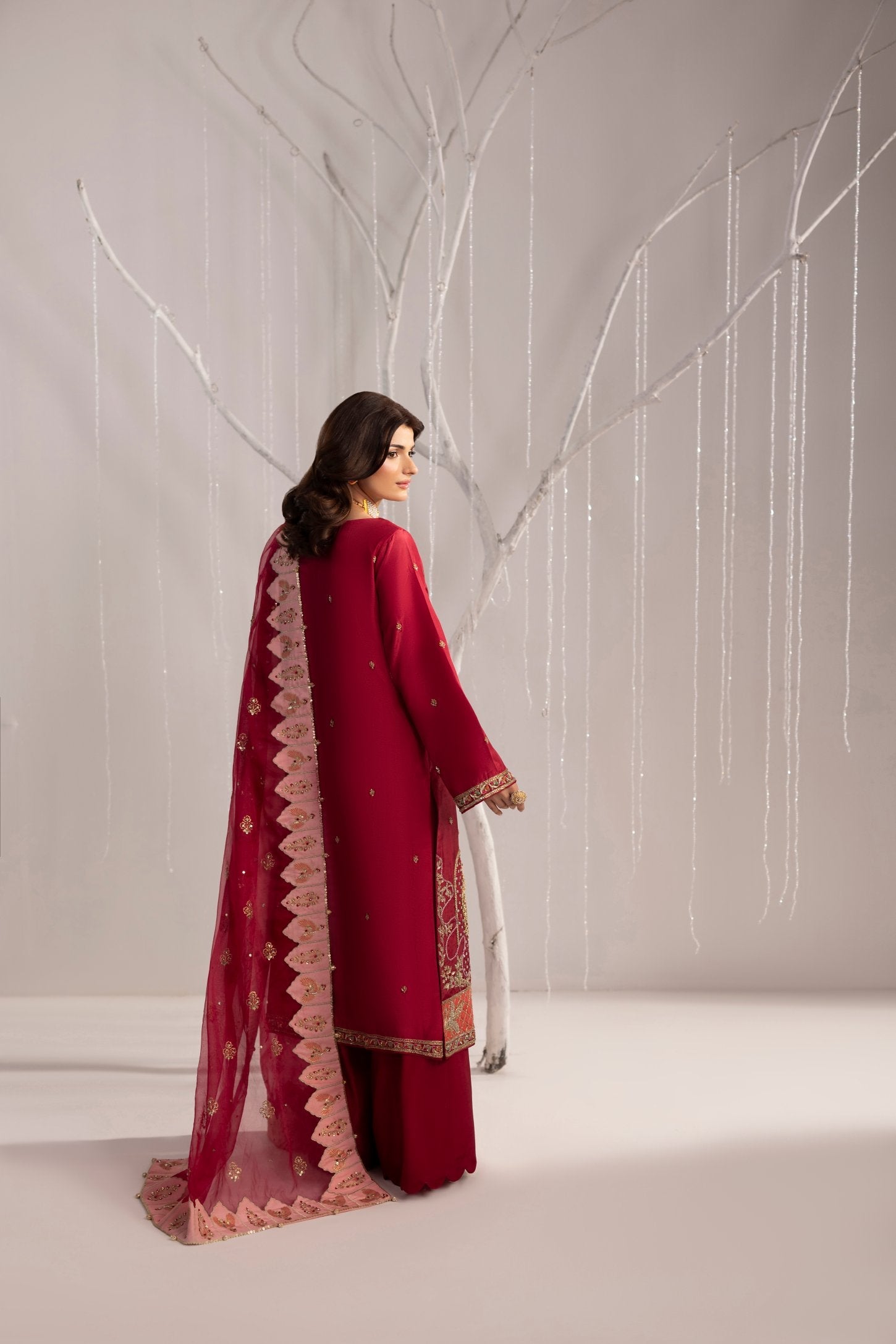 Undeniably underrated is red in our opinion this season but Scarlet Reverie brings red back in style, the Shurooq way. This entirely on raw silk, this gown has an open jacket design with modern floral ornamentation beautifully embellished in golds and a touch of orange. Paired is a sleek scalloped trouser and an inner. The organza dupatta brings all the focus on its embellished details and the stunning pink appliqué border.