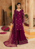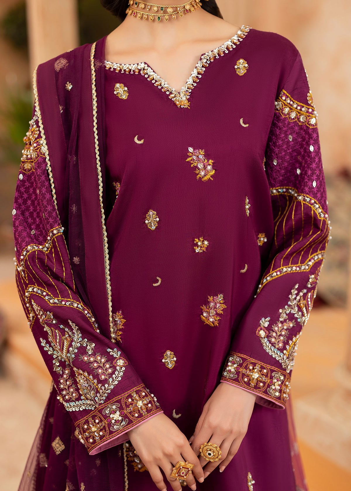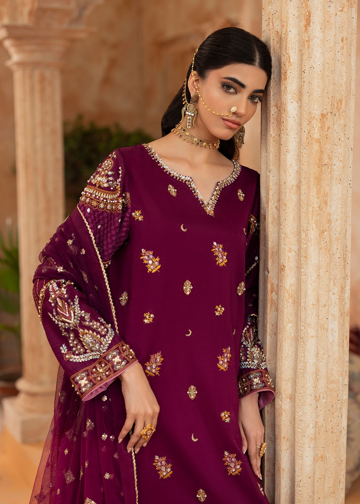 Made on royal silk magenta, Nehel shines brighter than diamonds. Gold and magenta embroideries inspired with floral inspirations cover the entire ensemble. Pearls, sequins and crystals make the most beautiful neckline along with intricately decorated sleeves. Embroidered silk flared trousers and a fully embroidered net duppata add classic traditional elements to this elegant look.