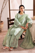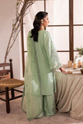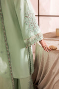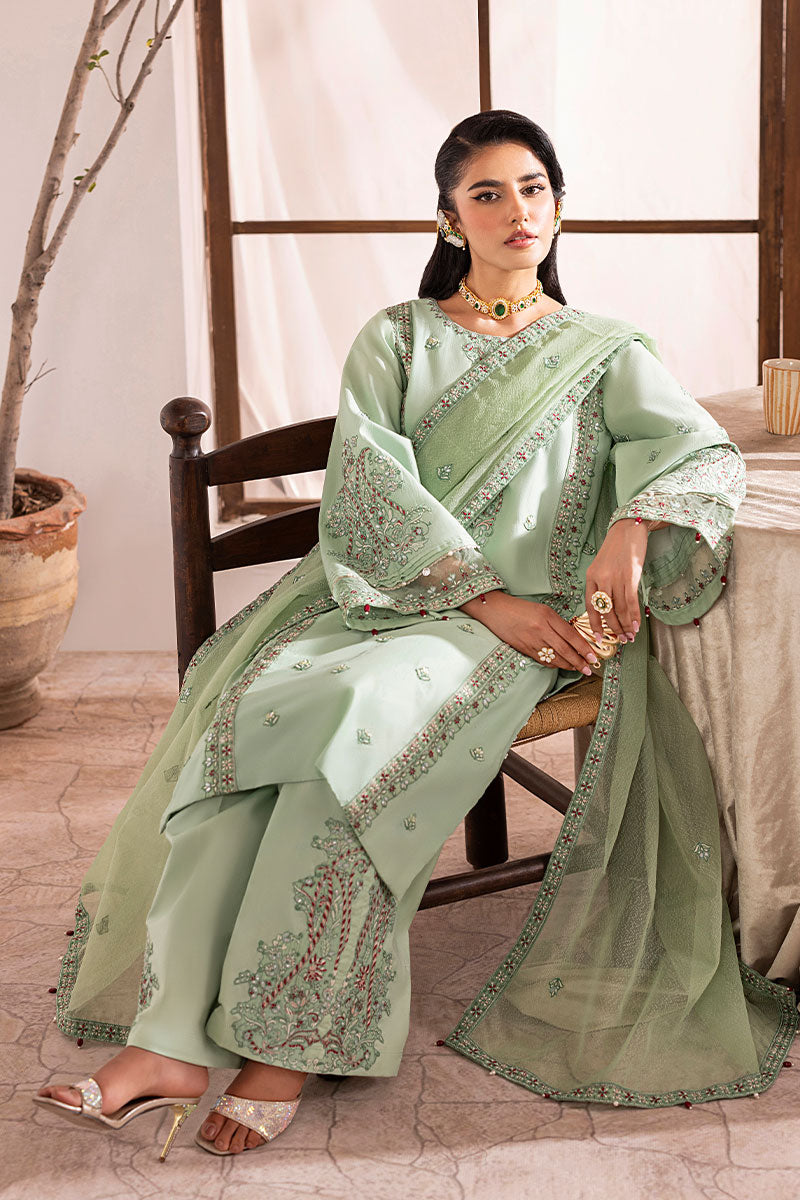 Evee in pastel mint — delicate, soft, and made for Eid. A breezy lawn shirt with a paisley neckline, all‑over florals, organza‑bordered sleeves, and handmade tassels on both the shirt and dupatta. Fully embroidered culottes and a dotted net dupatta complete this graceful showstopper.