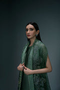 An elegant three-piece suit in dark green, featuring a plain short shirt made from pure tassel silk. It is paired with a traditional shalwar, highlighted with a subtle rhinestone spray that complements the base color. The look is completed with a pure organza dupatta, beautifully adorned with silver rhinestones in a floral pattern, adding a touch of sophistication.