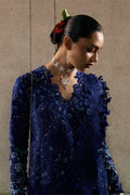 An indigo blue raw silk angrakha‑style peplum shirt with self‑embroidery, sequins, and cutwork; V neckline trimmed like a necklace; fitted sleeves in lighter blue gradient with 3D organza florals.