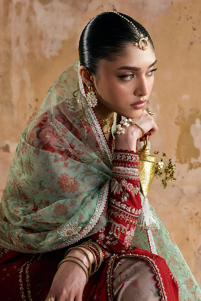 Printed organza dupatta with green base, gold embroidery, and satin silk binding