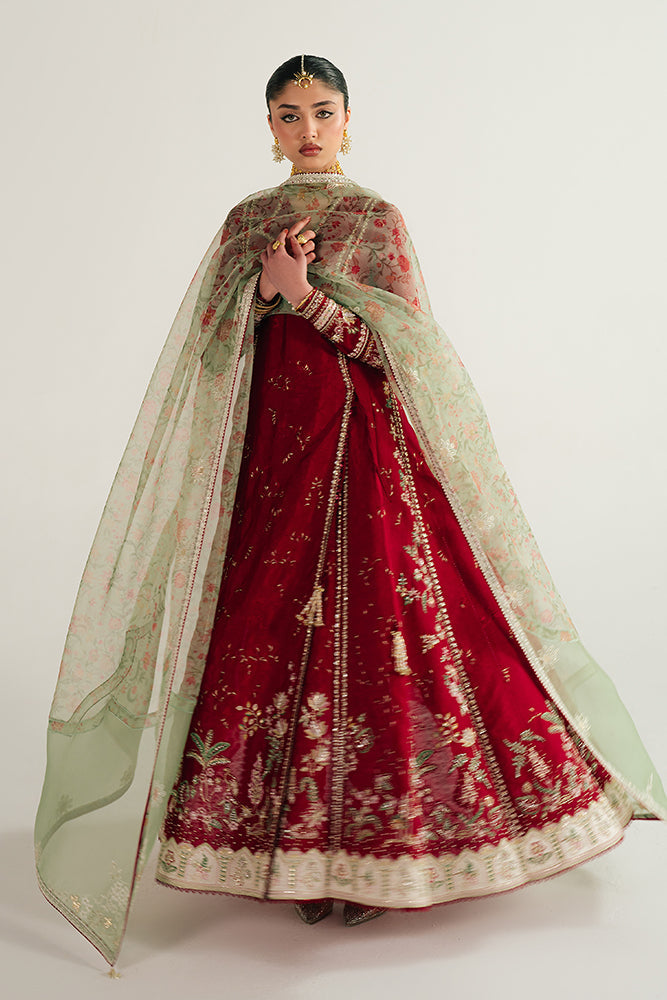 Jacquard silk angrakha pishwaas with shikargah embroidery and tassel detailing