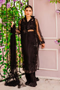 Floral embellished black organza shirt paired with crop top camisole and crushed pants.