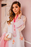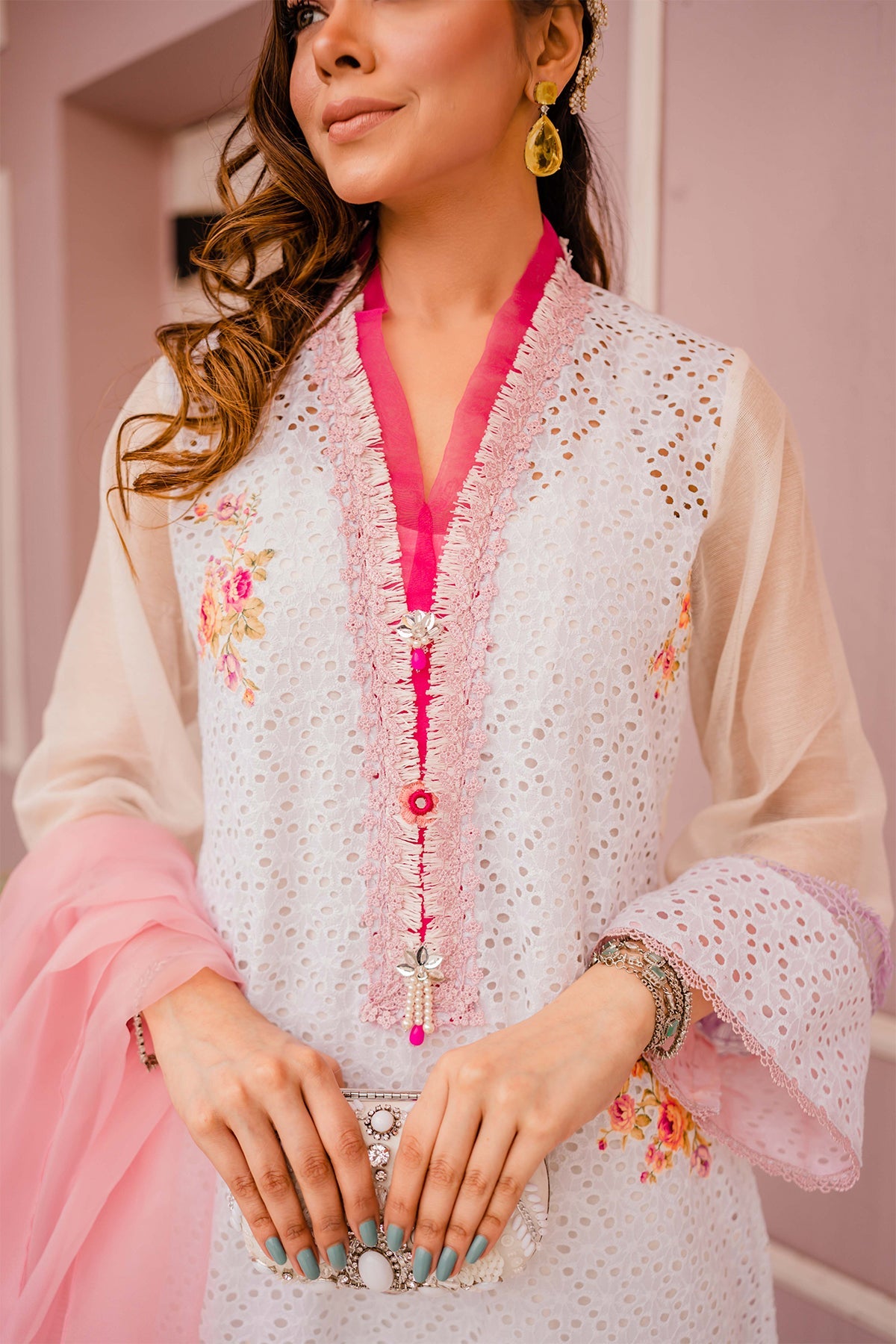 A white chikan shirt adorned with minimalistic vintage floral print, lace and 3 tones organza edgings paired with pink organza dupatta and white pants.