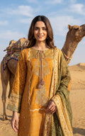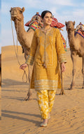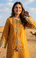 A warm saffron-toned outfit reflecting desert sunsets. Designed with heritage bandhani prints layered with delicate gold zarree embroidery, this 3-piece set exudes understated luxury.