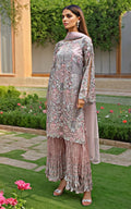 A harmonious blend of tradition and contemporary aesthetics. The cascading organza embroidered shirt boasts intricate mirror, sequin, and tassel embellishments, complemented by cutwork details on the sleeves and daman. Complete the look with crushed gharara and a net embellished dupatta adorned with tiki stones and pearls, finished with luxurious gota on all sides.