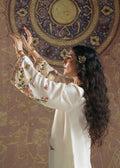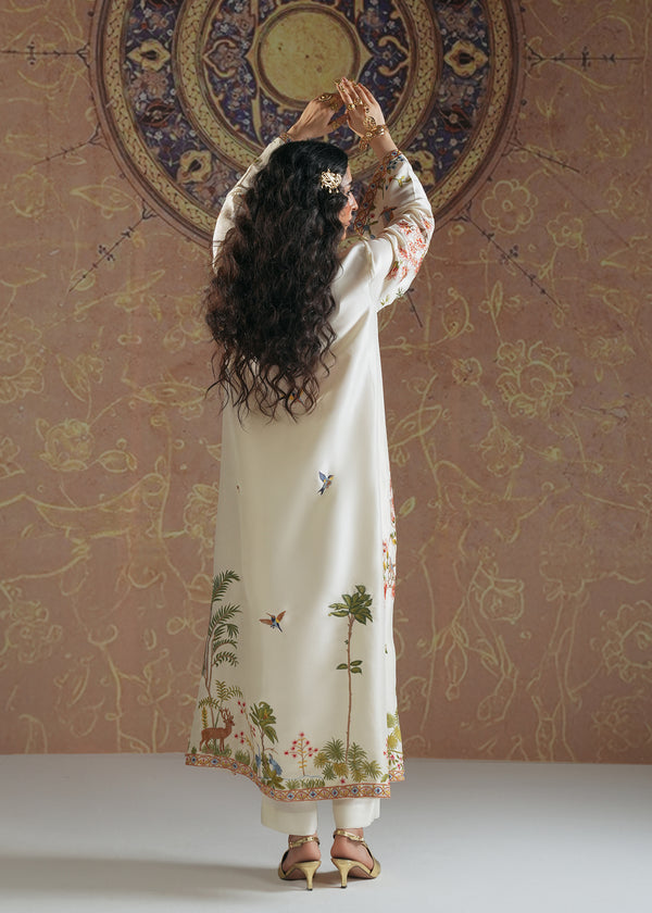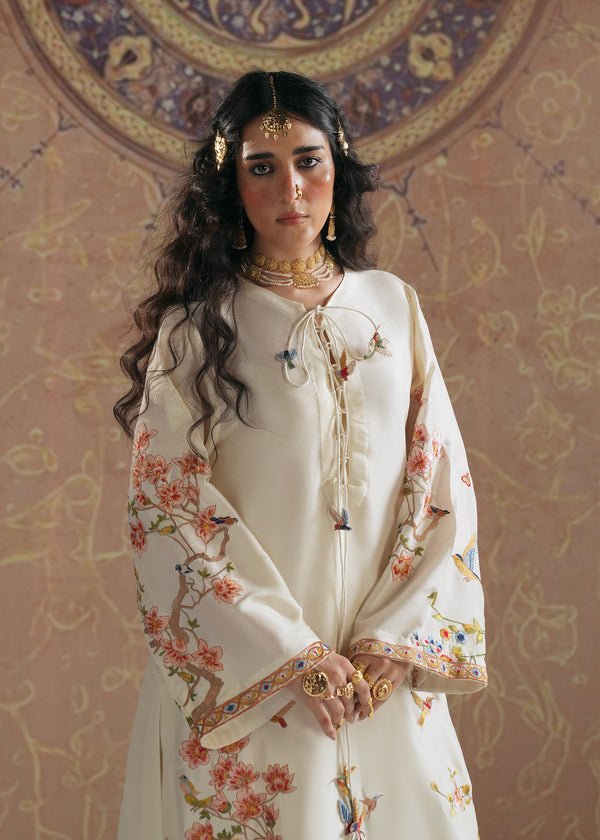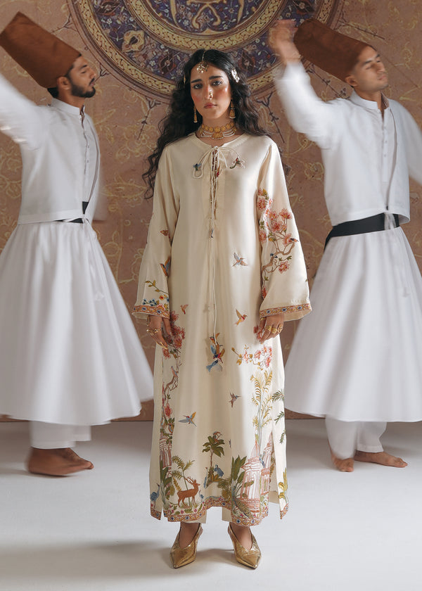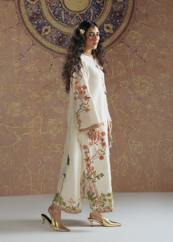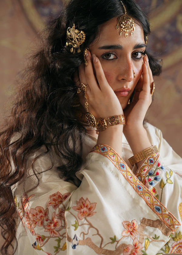 This exquisite shirt is crafted from pure raw silk, offering a luxurious drape and timeless elegance. The design draws inspiration from the regal Shikar gah motifs blended seamlessly with intricate Turkish artistry, creating a unique fusion of cultural heritage and contemporary fashion. The shirt features a soft ivory base adorned with delicate embroidery of birds, flora, and architectural elements, reminiscent of royal hunting grounds and Ottoman aesthetics. With its flowing silhouette, wide sleeves, and ornate detailing, this piece beautifully embodies sophistication and tradition, making it a true statement outfit for festive and formal occasions.