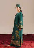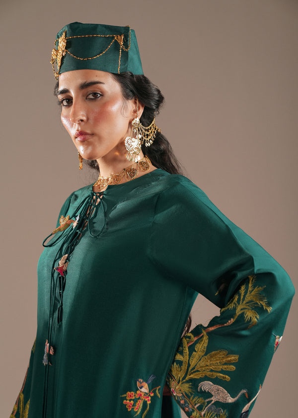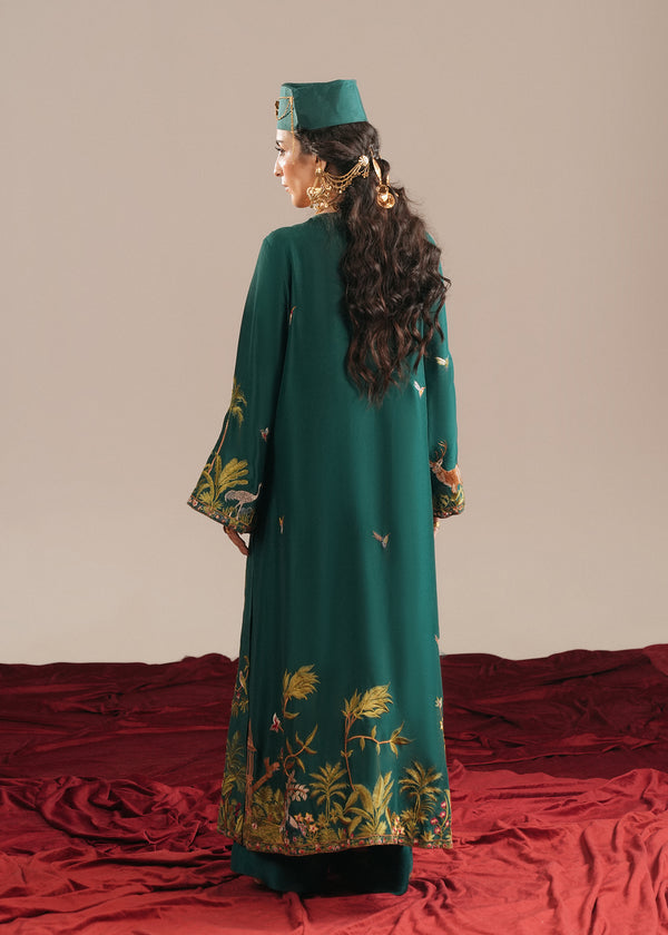 Crafted in a deep emerald green hue, this outfit exudes a mysterious charm. Made from pure raw silk, it carries a luxurious and timeless appeal. The embroidery, inspired by the beauty of nature and the grandeur of Shikar gah, adds an elegant touch with its intricate detailing. Each motif enhances the richness of the Resham, making the ensemble a perfect balance of sophistication and allure.